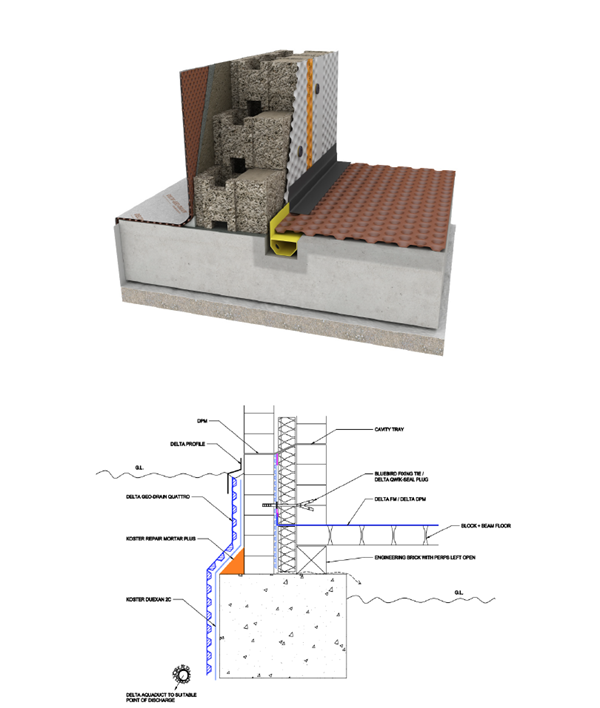 Pre-backfill, Delta GeoDrain Quattro, a unique drainage protection system/external waterproofing membrane that works in conjunction with Type A External Waterproofing systems, was installed as a drainage and protection membrane, which was flashed in and buried just below the external ground level, using a Delta MS Profile